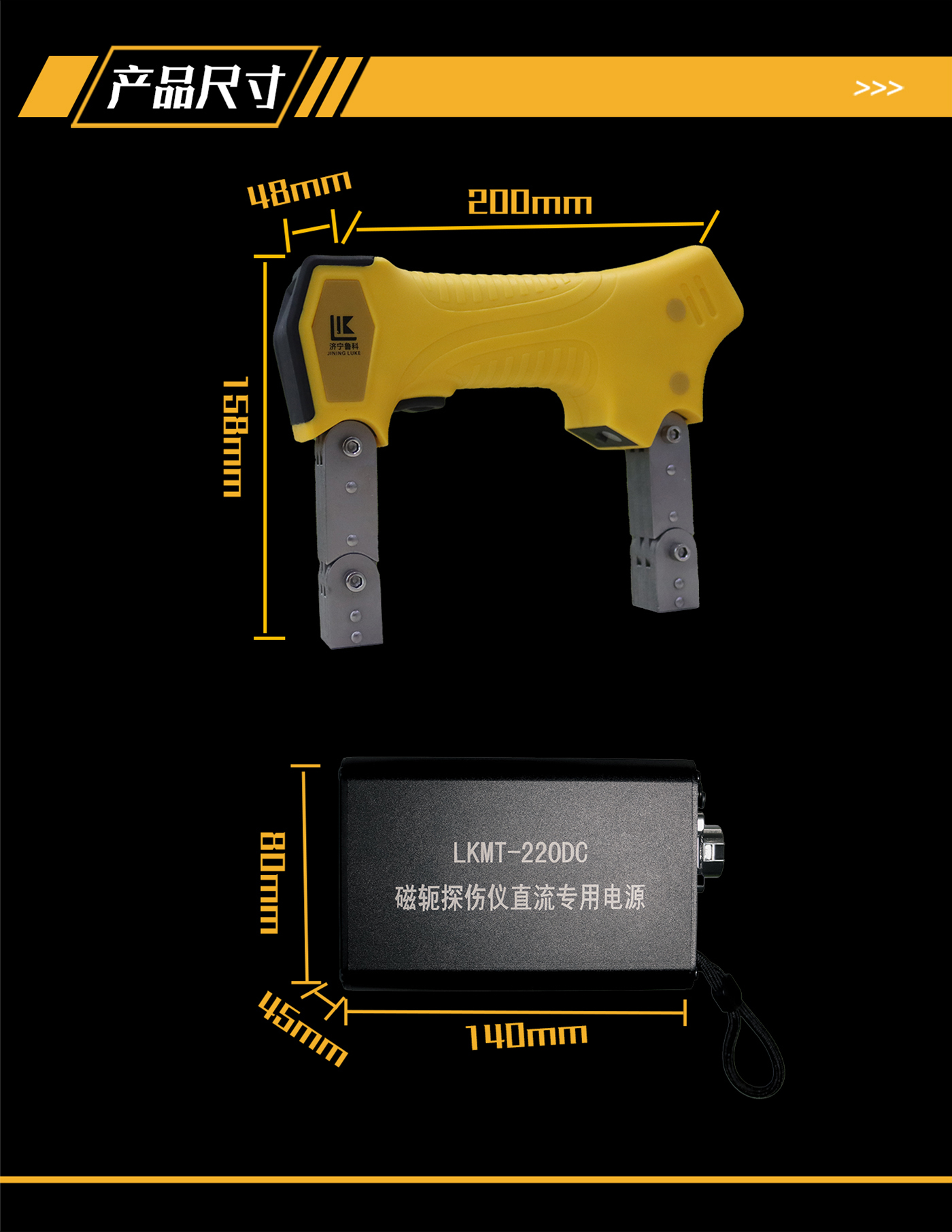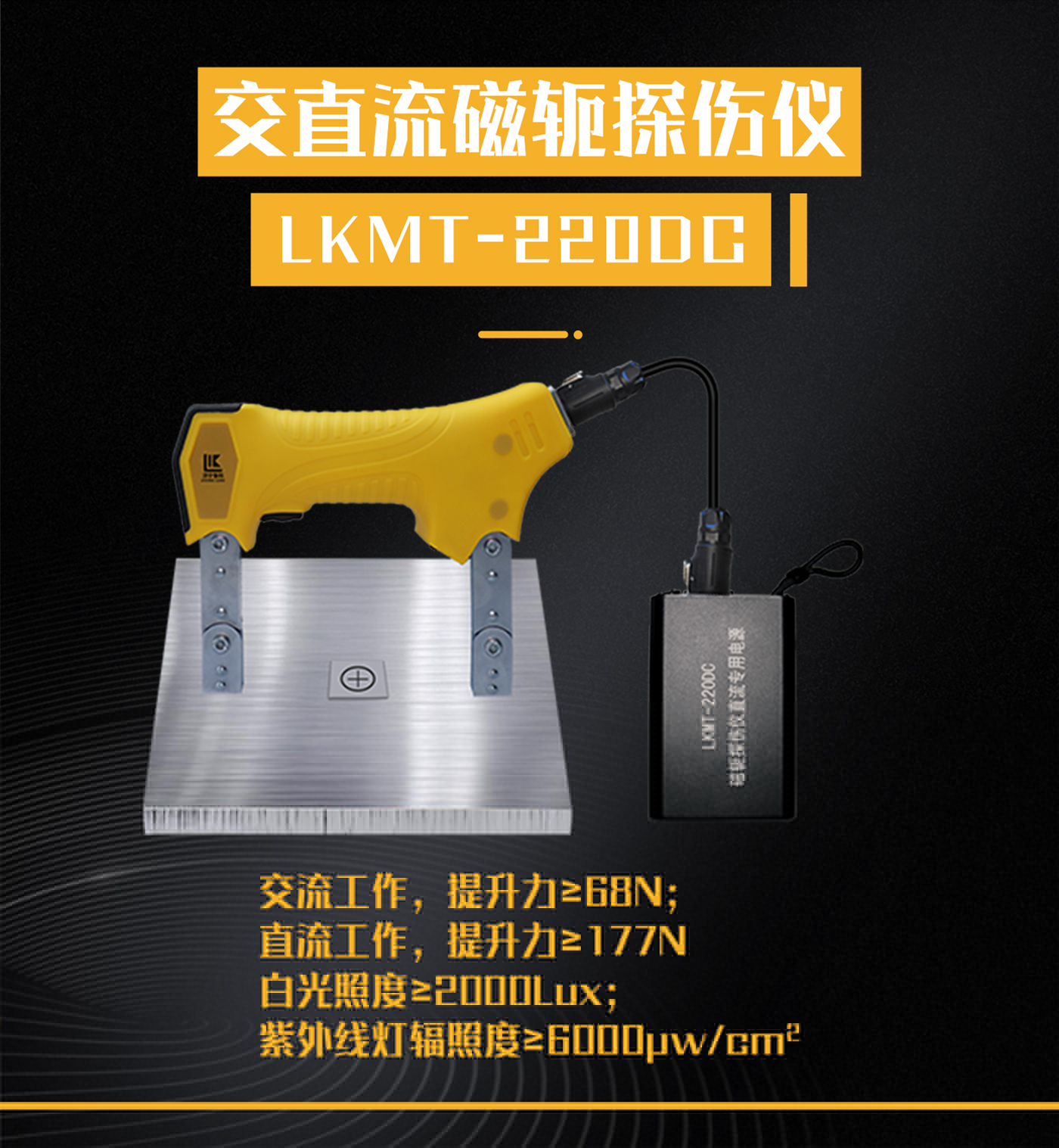 1、LKMT-220DC交直流磁軛探傷儀由D型探頭、電源適配器、鋰電池電源組成;產生交流或直流磁場進行探傷。