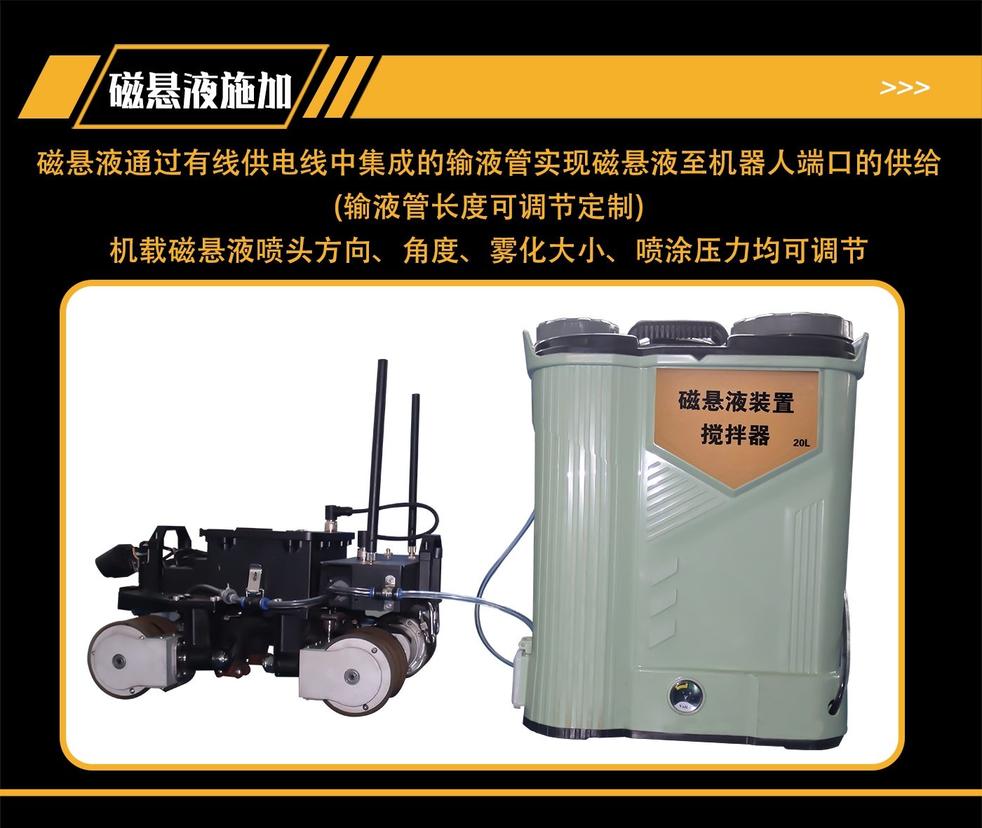 (4)機(jī)載磁懸液噴頭方向、角度、霧化大小、噴涂壓力均可調(diào)節(jié)。