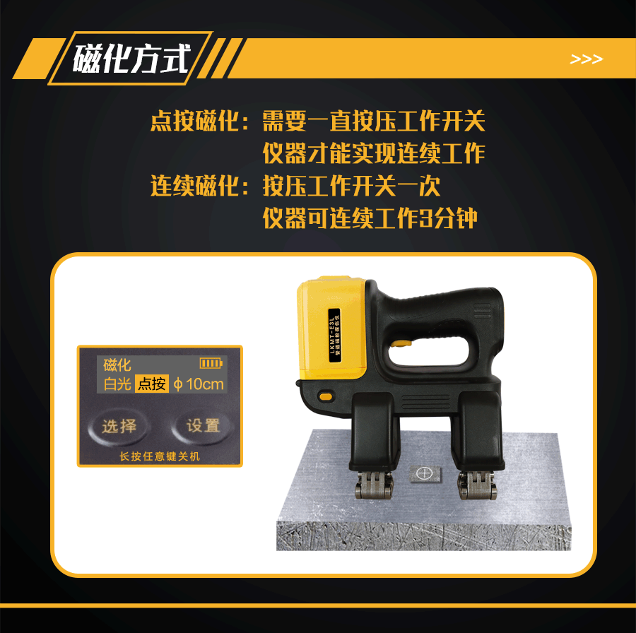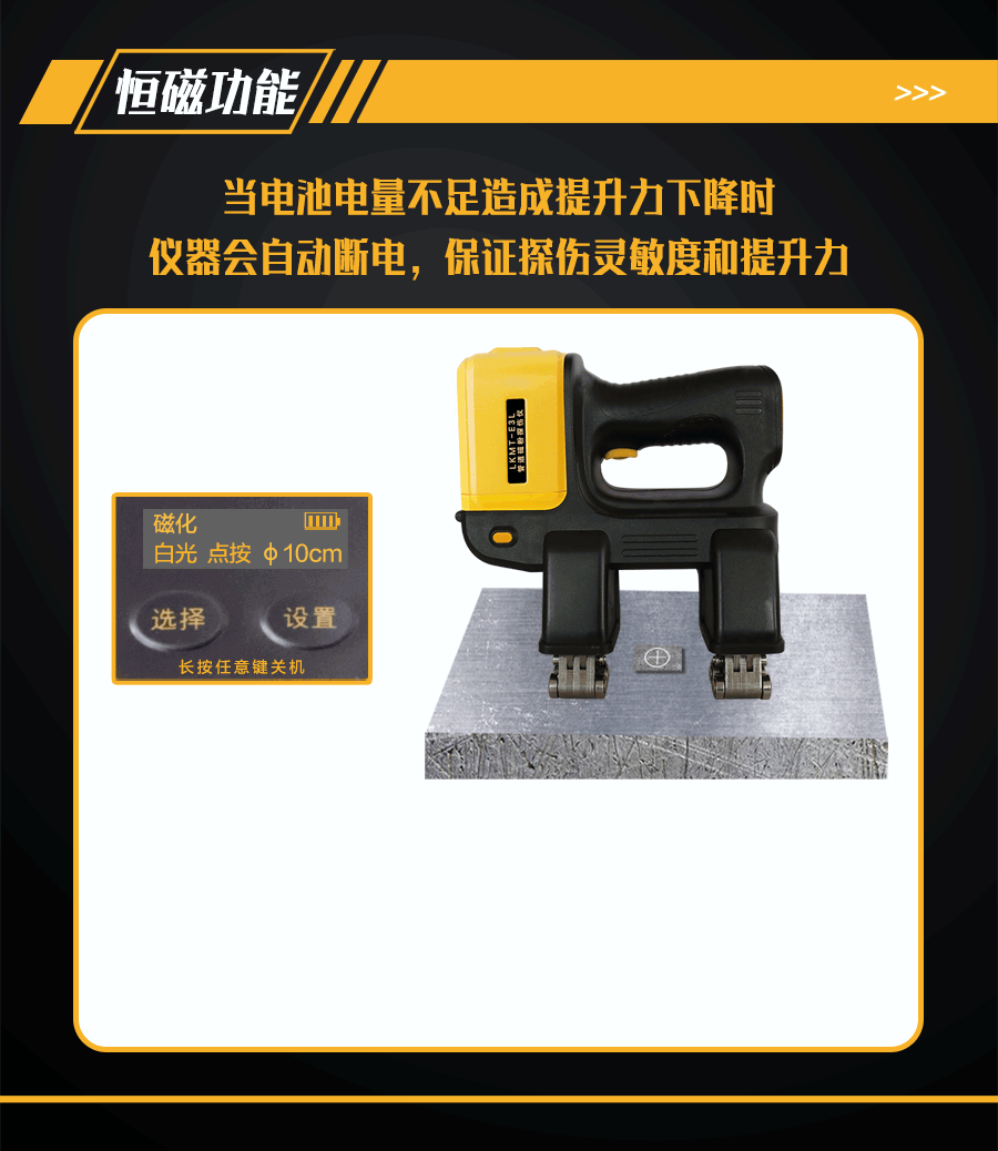 6、恒磁控制功能,因電量下降導致提升力不滿足探傷需求時自動斷電,保證探傷靈敏度。