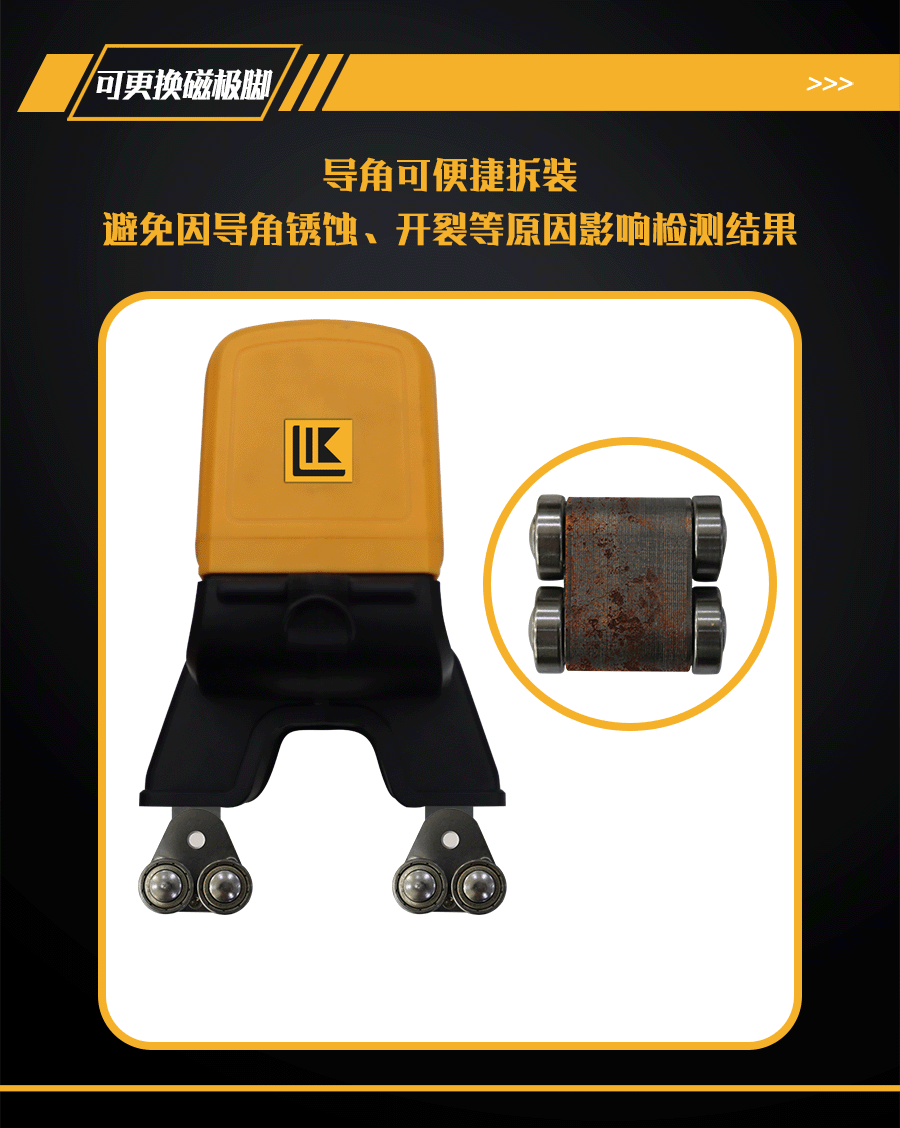 7、每個磁極腳安裝4只軸承,步進探傷無阻力;每個磁極腳可自行便捷拆裝、更換。